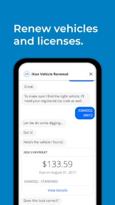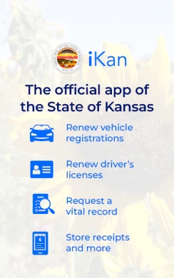 Download the official app of Kansas - iKan - to renew your vehicle and order Vital Records such as birth, death, marriage and divorce, all with the help of a friendly chatbot. Get your certificates with just a couple clicks! Select order by mail or pick up in the office and get notified when it is ready. iKan is offered as a convenience to the Kansas residents.